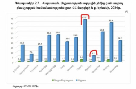 «Աղքատությունը Հայաստանում 2024» զեկույցում ՀՀ վիճակագրական կոմիտեն փաստում է, որ Շիրակի մարզը շարունակում է մնալ Հայաստանի ամենաաղքատ մարզը։ Շիրակում աղքատ է բնակչության գրեթե կեսը՝ 43 տոկոսը, Շիրակին հաջորդում է Տավուշը՝ 39,9 տոկոսով։ Իսկ աղքատության ամենցածր ցուցանիշը գրանցվել է Սյունիքում՝ 6․2 տոկոս։