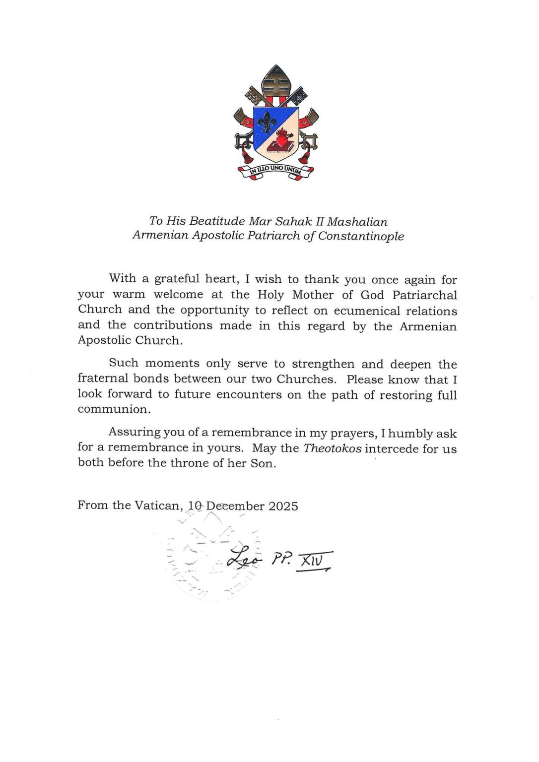 Այս մասին հաղորդագրություն է տարածել Պոլսո հայոց պատրիարքարանը։ Նշվում է, որ նամակում Հռոմի պապը շնորհակալություն է հայտնել Պոլսո հայոց պատրիարքին Ստամբուլի Սուրբ Աստվածածին եկեղեցում իրեն ջերմ ընդունելության արժանացնելու համար։ «Այդպիսի պահերը նպաստում են մեր երկու եկեղեցիների միջև եղբայրական կապերի ամրապնդմանն ու խորացմանը»,- ասված է նամակում։