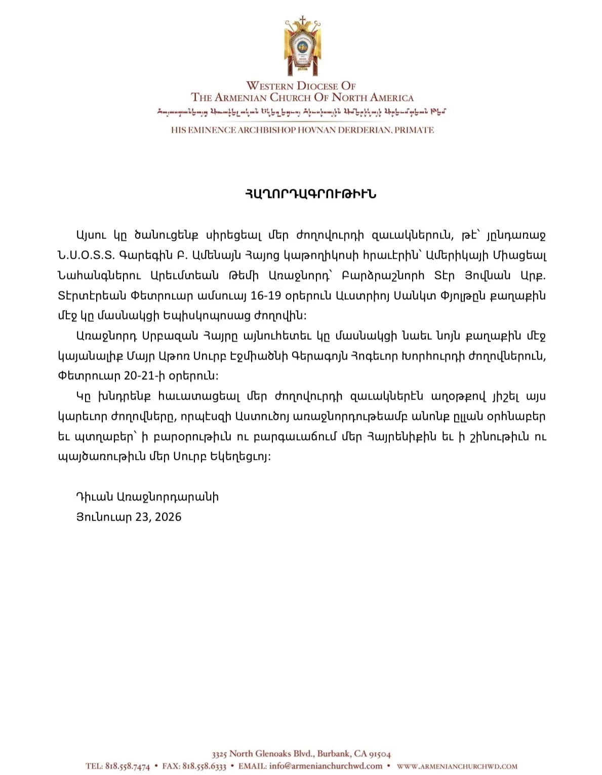 «Առաջնորդ Սրբազանը կմասնակցի նաեւ Մայր Աթոռի Գերագույն հոգեւոր խորհրդի ժողովներին։ Խնդրում ենք մեր հավատացյալ ժողովրդին՝ աղոթքով հիշել այս երկու ժողովները, որ դրանք Աստծո առաջնորդությամբ լինեն օրհնաբեր եւ պտղաբեր»,– ասված է հայտարարության մեջ։