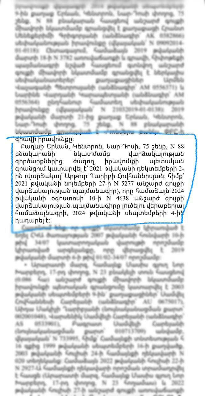 • Նար-Դոսի փողոցի վրա գտնվող բնակարանի վարձակալության պայմանագիրը կնքվել է 2021 թվականի նոյեմբերի 27-ին,