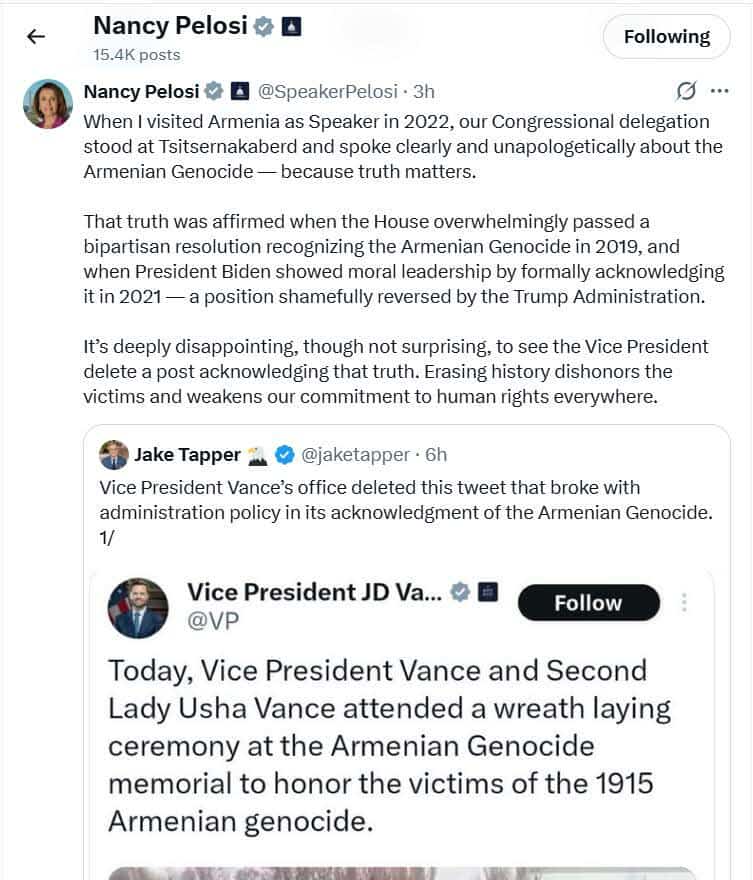 Ամերիկացի դեմոկրատ քաղաքական գործիչ, Ներկայացուցիչների պալատի նախկին խոսնակ Նենսի Փելոսին իր X-ի էջում անդրադարձել է ԱՄՆ փոխնախագահ Ջեյ Դի Վենսի այցին Ծիծեռնակաբերդի հուշահամալիր ու այդ այցի մասին սոցցանցում արված գրառումը հեռացնելու աղմկոտ իրադարձությանը։