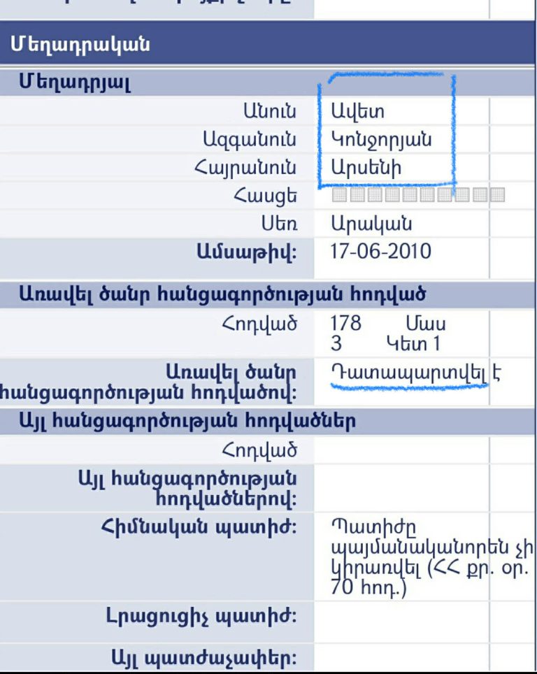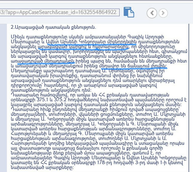 Գործը քննվել է արագացված կարգով։ «Դատալեքս»-ում հրապարակված դատական ակտում բառացի նշված է, որ ամբաստանյալ Ավետ Կոնջորյանը հայտարարել է.
