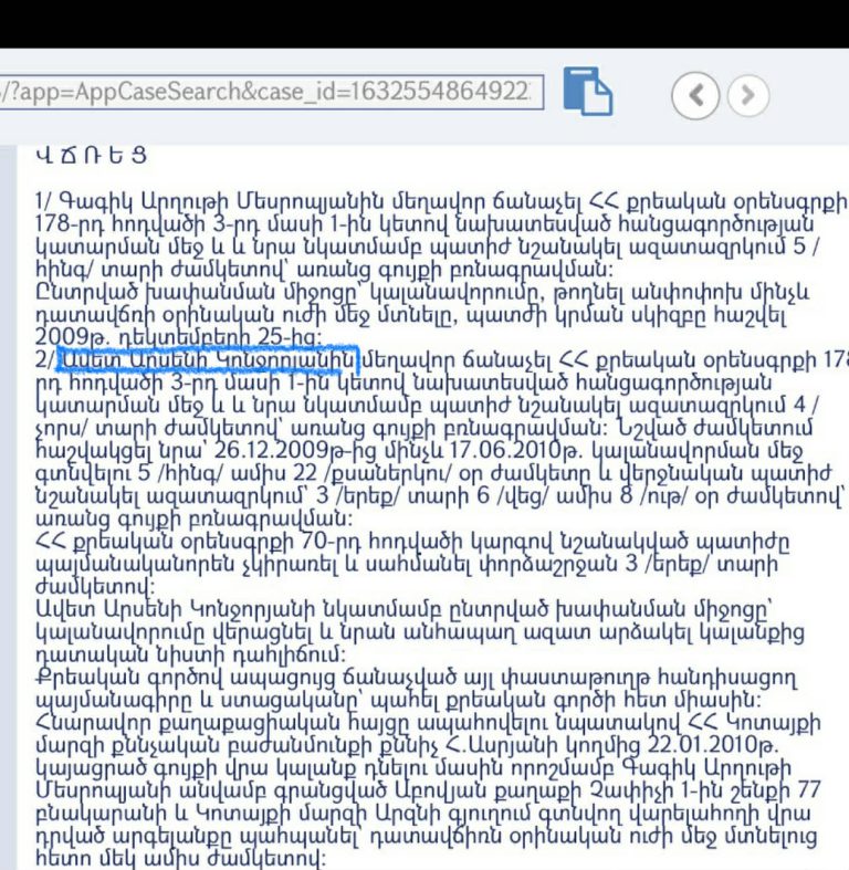 17.06.2010 թ․-ին դատարանը Ավետ Կոնջորյանին մեղավոր է ճանաչել ՀՀ քրեական օրենսգրքի 178-րդ հոդվածի 3-րդ մասի 1-ին կետով նախատեսված հանցագործության կատարման համար և նշանակել 4 տարվա ազատազրկում։