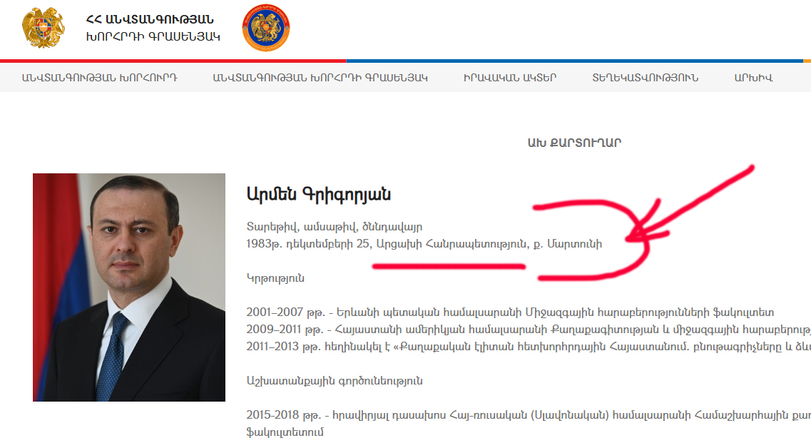 Իսկ ԱՔ քարտուղարի՝ ԱԽ պաշտոնական կայքում զետեղված նույնքան պաշտոնական կենսագրականի մեջ գրված է, որ նա՝ Արմեն Գրիգորյանը ծնվել է. «1983 թվականի դեկտեմբերի 25, Արցախի Հանրապետություն, ք․ Մարտունի»: