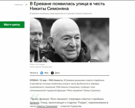 Ռուսական լրատվականները լայնորեն լուսաբանել են Երևանում Նիկիտա Սիմոնյանի անվան փողոցի անվանակոչությունը