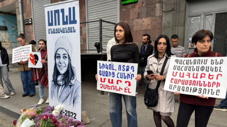 Քաղաքացիները ծաղիկներ են խոնարհում 28 տարեկանում վթարից մահացած Սոնա Մնացականյանի նկարի առաջ, որտեղ դնում են նաև խաղալիքներ՝ չծնված մանկան համար։ Ակցիայի մասնակիցների ձեռքերին «Պահանջում ենք սահմանափակել մահաբեր շարասյուների արագությունը», «Նիկո՛լ, ոտքդ գազից հանի, մարդիկ չմեռնեն էլի» գրությամբ պաստառներ։
