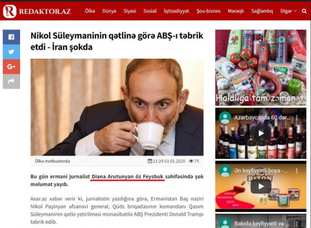 Հղում անելով ինչ որ օգտատիրոջ, տենդորեն տարածում են , որ իբրև թե ՀՀ Վարչապետ Նիկոլ Փաշինյանը շնորհավորել է ԱՄՆ-ին Սուլեյմանի սպանության կապակցությամբ: Մնացած «լրատվամիջոները» այս նյութն արդեն տարածում են հղում անելով ռեդակտոր.ազ-ին... Սա կոչվում է քարոզչություն, Հայաստանին իբրև թե խոցելի և թշնամիներով շրջափակված»։