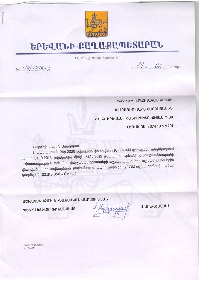 Ստացված գրավոր պատասխանում (կցվում է) նշված է, որ նշված 14 ամսում Երևանի քաղաքապետարանի աշխատակազմի և Երևանի վարչական շրջանների աշխատակազմերի աշխատակիցներին վճարված պարգևավճարների ընդհանուր չափը շուրջ 1.782 աշխատակիցների համար կազմել է 2.102.213.050 ՀՀ դրամ (շուրջ 4.400.000 $)։