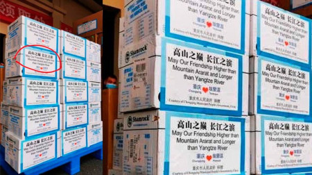 Ապրիլի 8-ին Չինաստանից Հայաստան ուղարկված մարդասիրական օգնության արկղերի վրա եղած Արարատ լեռան վերաբերյալ գրությունը իրարանցում էր առաջացրել Թուրքիայում։ Իսկ գրությունը հետևյալն էր. «Թող մեր բարեկամությունը լինի ավելի բարձր, քան Արարատ լեռը և ավելի երկար, քան Յանցզի գետը»: