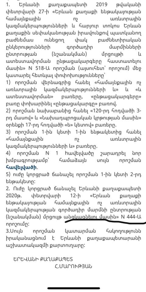 Հիշեցնեմ, որ նախարարի հրամանն ուժի մեջ է մտել սույն թվականի ապրիլի 11-ին, սակայն բախվում ենք հերթական անգամ քաղաքապետի պայծառատեսությանը: 10.04.2020 թվականին կայքում կա քաղաքապետի հրաման, որում հղում է արվում մեկ այլ հրամանի` 12.02.2020 թվականի «Երևան քաղաքի ենթակայության համայնքային ոչ առևտրային կազմակերպության գործադիր մարմնի ընտրության (նշանակման) մրցույթ անցկացնելու մասին» N 444-Ա որոշումը (կետ 2):