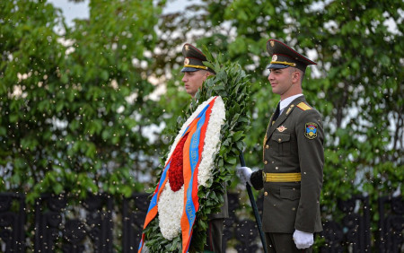 ՀՀ քաղաքական վերնախավը՝ վարչապետ Նիկոլ Փաշինյանի գլխավորությամբ, «Հաղթանակ»-ի զբոսայգում է՝ հարգանքի տուրք մատուցելու Երկրորդ համաշխարհային պատերազմի և Արցախյան ազատամարտի մասնակիցների հիշատակին։ Նրանք ծաղիկներ են խոնարհում անմար կրակի մոտ։
