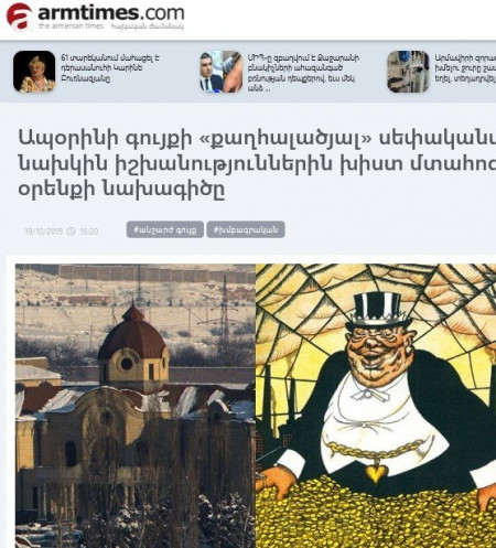 Նիկոլի ընտանեկան թերթի կայքում քաղաքացիների գույքը խլելու օրենքը գովերգող մի հոդվածի այսպիսի խոսուն պատկերազարդում տեսա. սրանից լավ ներկա իշխանությունների անունից խոսողներն է՛լ ինչպե՞ս ասեին, որ իրենց էությամբ բոլշևիկ են, եթե ոչ բոլշևիկյան քարոզչությունն օգտագործելով։