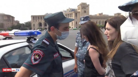 Երևանում այսօր՝ հուլիսի 21-ին կառավարության շենքի մոտից ոստիկանները ձեռնաշղթաներ հագցրեցին և բերման ենթարկեցին երկու աղջիկների, որոնք դիմակ չէին կրում: Ոստիկաններից մեկը պարզաբանեց, որ ոստիկանները մոտեցել են դիմակ չկրող աղջիկներին, նրանք չեն ենթարկվել ոստիկանների օրիանակն պահանջին, դրա համար բերման են ենթարկվել Կենտրոնականի բաժին: Նրա խոսքով, ձեռնաշղթաներ հագցնելու պատճառը նրանց ոչ ադեկվատ պահվածքն է եղել. «Այսինքն մոտեցել են, քաշքշել են, հարվածել են, ճանկռել են: Դրա համար կիրառվել է ուժ և ձեռնաշղթաներ են հագցրել»: