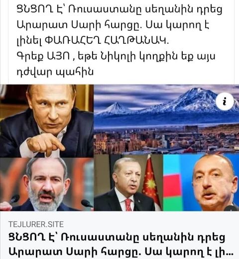 Տեսնես Նիկոլը խաբա՞ր է, որ առանց շախի` «չերեզ Պուտին», մատ է արել թուրքերին ու ադրբեջանցիներին. բալիստիկ հրթիռը հանել, խփել է Թուրքիայի ճակատին, ու հիմա Էրդողանը, Պուտինի ոտներն ընկած` աղաչում-պաղատում է խնայել իրենց, կանգնեցնել հայկական էքսպանսիան։ Պուտինն էլ չեմուչում է անում, ասում է` իմ պայմանը պայման է. Արարատ սարը կվերադարձնե՞ս հայերին, լա՛վ, չե՞ս վերադարձնի` մեղքը քո վիզը։ Դե, իսկ Ալիևը վախից տակը լցրել է` ահուդողով սպասում է, թե ինչով կավարտվեն Պուտին-Էրդողան բանակցությունները։