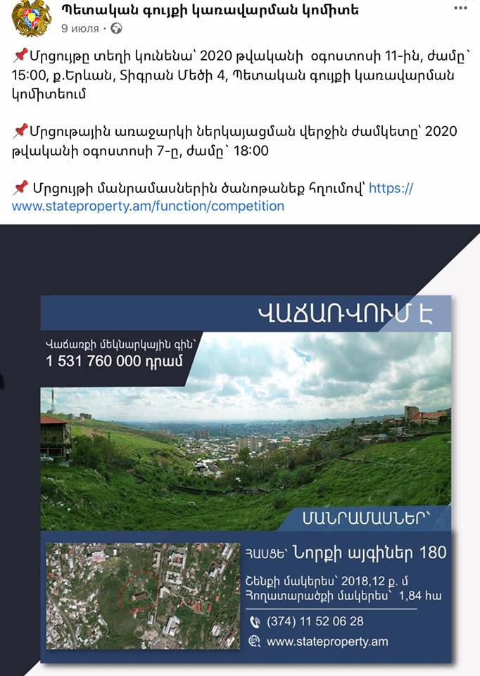 «Կանաչ ապագա» բնապահպանական հասարակական կազմակերպության անդամ Վահագն Վարագյանը ֆեյսբուքյան իր էջում գրառում է արել՝ տեղեկացնելով որ Պետական գույքի կառավարման կոմիտեն վաճառքի է հանել Նորքի այգիները։