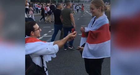 Երեկ Մինսկում հազարավոր բելառուսներ մասնակցել են Խաղաղության և անկախության երթին: Բողոքի ցույցի ժամանակ մի երիտասարդ տղա իր ընկերուհուն ամուսնության առաջարկ է արել: