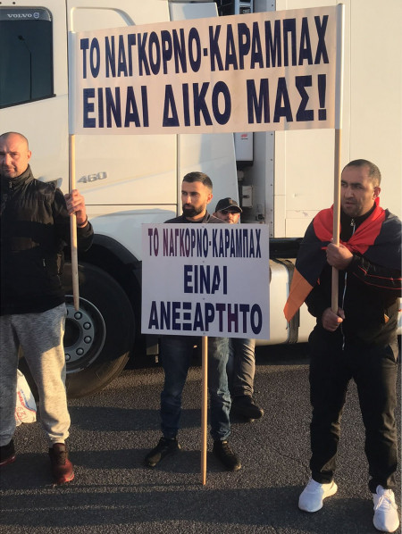 Ցուցարարները ճանապարհը փակելուց հետո ոտքով շարժվում են դեպի սահման: Նրանց ձեռքին կան բազմաթիվ պաստառներ, որոնց վրա գրված է. «Ուժեղ Արցախ», «Լեռնային Ղարաբաղը մերն է», «Մենք Արցախի հետ ենք», «Ազերի մարդասպանները պետք է պատժվեն», «Ճանաչեք Արցախը»: