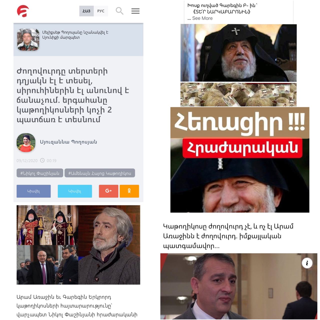 Ամենյան Հայոց և Մեծին Տանն Կիլիկիո կաթողիկոսների կողմից Նիկոլ Փաշինյանին հրաժարականի պահանջ ներկայացնելուց հետո, իշխանական լրատվականներն ու ֆեյքերը իսկական արշավ են սկսել եկեղեցու, հոգևորականների և երկու կաթողիկոսների դեմ: