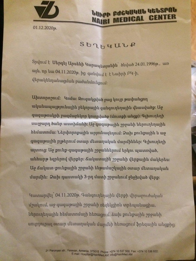 Հատուկ նշանակության ջոկատի մարտիկ և սամբոյի Եվրոպայի չեմպիոն Սերգեյ Կարապետյանը Ստեփանակերտից ծանր վիրավորում է ստացել Սղնախ գյուղի մոտ մարտերում, Շուշիի ուղղությամբ: Նա ամբողջովին պարալիզացված է, բայց վիրահատությունը Գերմանիայում նրան կյանքի կվերադարձնի: Ստորև բոլոր փաստաթղթերն են ու հաշվեհամարները, խնդրում ենք բոլորին օգնել մեր եղբորը», - գրված է ВКонтакте սոցկայքի Борцы Армении խմբում: