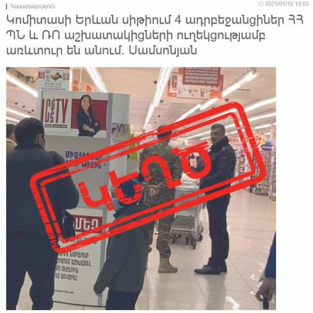 Սոցցանցերում և մամուլում տեղեկություն է տարածվում այն մասին, թե իբր ժամեր առաջ Կոմիտասի «Երևան սիթի» սուպերմարկետների ցանցում ՀՀ պաշտպանության նախարարության աշխատակիցների ուղեկցությամբ 4 ադրբեջանցիներ գնումներ են կատարել։ Տեղեկությանը կից տարածվում է նաև լուսանկար։