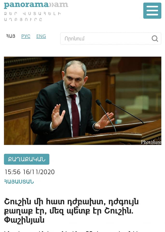 Նա դեռ չի պատժվել, նա զոհել է 5.000-ից ավել կյանք հողերի հանձնումը լեգիտիմացնելու համար։ Եվ նա դեռ ունակ է քանդելու ու մասնատված ծախելու մեր երկիրը։ Որովհետև ինչպես Շուշին էր դժբախտ ու դժգույն, այնպես էլ ցանկացած հայկական այլ քաղաք։