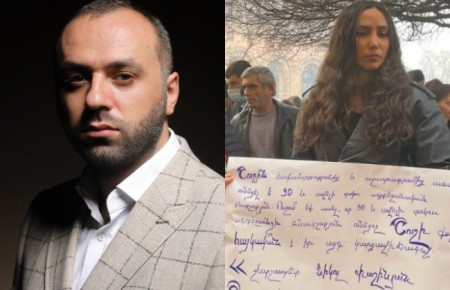 2․ Լրագրողի ձեռքին կա պաստառ, որն իր մասնագիտական գործունեության արդյունքում ակնկալվող տեղեկատվության դիմաց տեղեկատվության կրողի՝ ՀՀ վարչապետի կողմից պահանջված պայման էր․