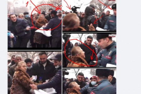 Եվ ահա այդ իրավիճակում լրագրողի վրա կատարվում է հարձակում, նշված կինը և նրան օգնող դիմակավորված մի երիտասարդ (տես նկարներում, նրանք նշված են՝ 1 և 2 համապատասխանաբար) խլում են փաշինի ասածի մեջբերմամբ թղթե պաստառը, սաստիկ ատելությամբ ծվեն-ծվեն են այն անում, դրանով չբավարարվելով, չնայած բազմաթիվ ոստիկանական համազգեստով անձանց ներկայությանը, ակնհայտորեն հրելու և հարվածելու նպատակով, նշված կինը վրա է քշում լրագրողի վրա: Այսինքն՝ բացի լրագրողի մասնագիտական պարտականությունների կատարմանը խոչընդոտելուց, ակնհայտ խուլիգանական դրդումներով՝ բացահայտ անհարգալից վերաբերմունք է դրսևորվում հանրության նկատմամբ: Այսինքն, իմ համեստ կարծիքով, առնվազն կատարվել է քրեորեն պատժելի արարք, որը նախատեսված ՀՀ ՔՕ 164-րդ հոդվածի 1-ին մասով: