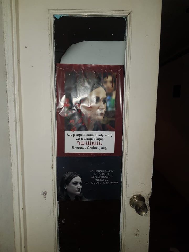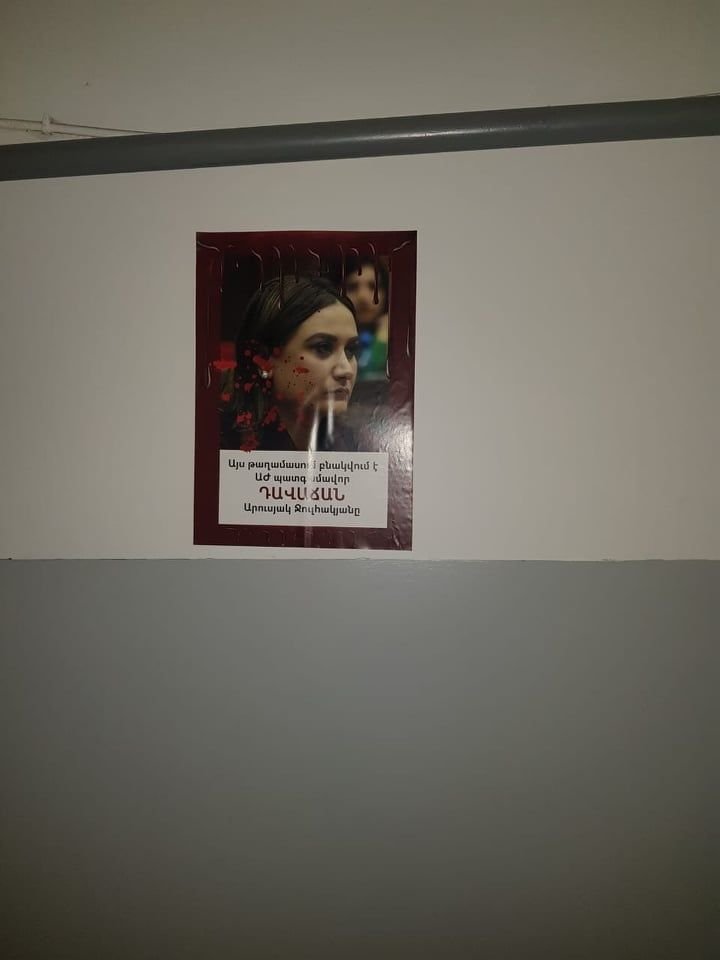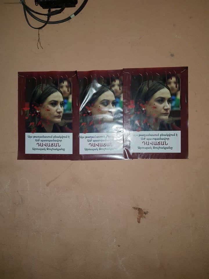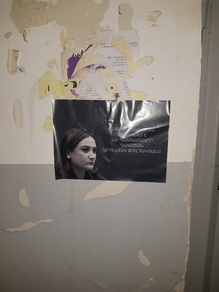 yerkir.am-ը գրում է․ Մի խումբ քաղաքացիներ ակցիա են իրականացրել ՀՀ Ազգային ժողովի իմքայլական պատգամավոր Արուսյակ Ջուլհակյանի բնակավայրի տարածքում՝ տարբեր տեղերում փակցնելով նրա լուսանկարը՝ «Այս թաղամասում բնակվում է ԱԺ պատգամավոր, դավաճան Արուսյակ Ջուլհակյանը» մակագրությամբ: