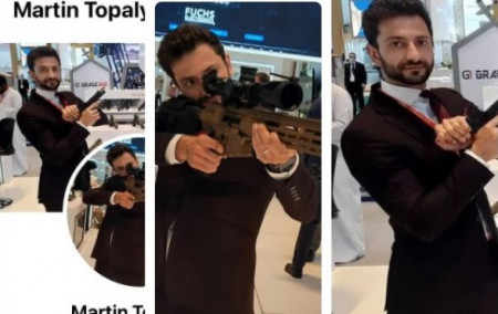 Լուսանկարում այդ գերթանկարժեք ու գերանիմաստ բուկլետային պատվիրակության անդամ Մարտին Թոփալյանն է, ով հրճվանքով նկարվում է այլ երկրների տաղավարներում եղած զենքի հետ ու տեղադրում ֆբ գլխավոր նկար: