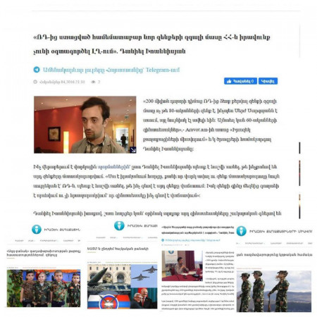 «Լոբբիստ-քարոզիչը ասում էր, թե ՌԴ-ից ստացած նոր զենքերի զգալի մասը Հայաստանը իրավունք չունի օգտագործել ԼՂ-ում։ Լրագրողներին կառաջարկեի այս թեմայով մեկնաբանություն վերցնել նրանից։ Թե այդ որ զանքերի մասին էր խոսքը»,-գրել է Աֆրիկյանը։