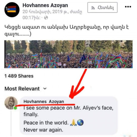 Սակայն ընդամենը երկու տարի առաջ նույն այս անձն իր ֆեյսբուքյան էջում լուսաբանում էր ադրբեջանական ընդդիմության հանրահավաքները և խոսում վաղը գալացող «ազատ և անկախ Ադրբեջանի մասին»...