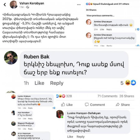 «Վիճակագրական Կոմիտեն հրապարակեց 2021թ․ փետրվարի տնտեսական ակտիվության ցուցանիշը՝ -5,3%: Հաշվի առնելով, որ անցած տարվա փետրվարն ուներ մեկ օր ավել՝ Հայաստանի տնտեսությունը համարյա վերականգնվել է։ Ու դա դեռ զրոյին մոտ տուրիզմի պարագայում։