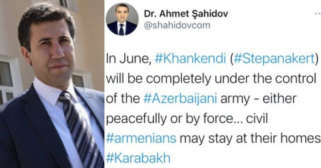 Люди уже открыто говорят о том, что в июне Степанакерт перейдет под контроль Баку. Об этом на своей странице в Facebook написал экс-омбудсмен Арцаха Рубен Меликян, касаясь заявления азербайджанского правозащитника Ахмеда Сахидова о том, что в июне Степанакерт будет полностью под контролем Азербайджана либо мирным путем, либо с применением силы.