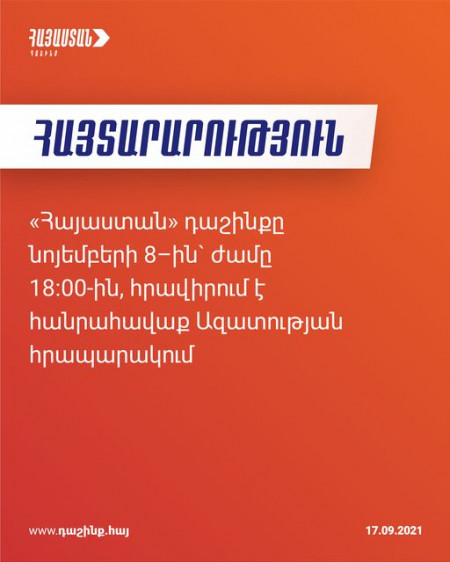 Уважаемый гражданин, это митинг во имя достоинства и организации сопротивления. Приходите на площадь Свободы и покажите своим участием, что отвергаете тюркизацию Армении, деарменизацию Арцаха, казнокрадство властей, очередное поражение нашей страны»,- говорится в заявлении.