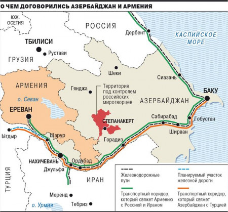 Российская газета «Коммерсантъ» опубликовала карту транспортных коридоров и железных дорог, вокруг которых пришли к согласию Армения, Россия и Азербайджан.