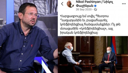 «Ճիշտ այս ժամերին, 4 տարի առաջ Հ1 եթերում պետք է լիներ Ալիևի դեմ և Ադրբեջանի ներքաղաքական կյանքը ցնցել սպառնացող Նիկոլի խոստացած այս հարցազրույցը: Հետո, անհասկանալի պատճառով այն չհեռարձակվեց: Պատճառաբանեցին՝ տեխնիկական խնդիրներ կան... Սեպտեմբեր 27-ին կլինի: Բայց այդ օրը եղավ ՊԱՏԵՐԱԶՄ... ինչի՞ մասին էր հարցազրույցը, մինչ այժմ անհայտ է»։
